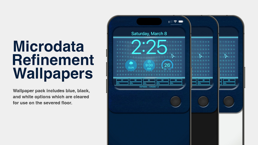 Bring the severed floor experience outside of Lumon with this Macrodata Refinement (MDR) wallpapers. The scary numbers change (as if) -- as your iPhone's time changes! The pack comes with 3 color options -- blue, black, and white -- to suit your lock screen aesthetic.